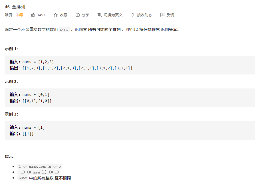 class Solution { List<List<Integer>> res=new LinkedList<>(); public List<List<Integer>> permute(int[] nums) { LinkedList<Integer> track=new LinkedList<>(); dfs(nums,track); return res; } public void dfs(int [] nums,LinkedList<Integer> track) { if(nums.length==track.size()) { res.add(new LinkedList(track)); return; } for(int i=0;i<nums.length;i++) { if(track.contains(nums[i])) continue; track.add(nums[i]); dfs(nums,track); track.removeLast(); } } }
