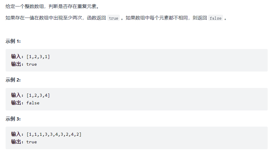 对于数组中每个元素,我们将它插入到哈希表中。如果插入一个元素时发现该元素已经存在于哈希表中,则说明存在重复的元素。