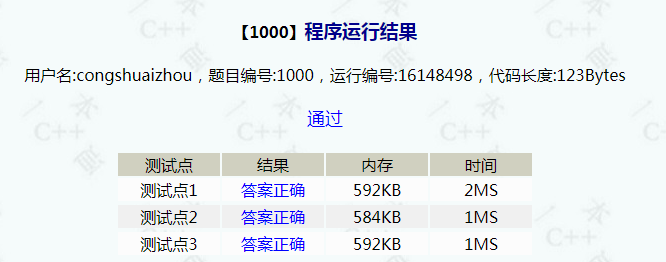 1 #include <iostream> 2 using namespace std; 3 int main() 4 { 5 int a,b,c; 6 cin>>a>>b; 7 c=a+b; 8 cout<<c<<endl; 9 return 0; 10 }