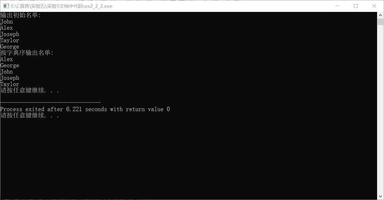 // 练习:使用选择法对字符串按字典序排序 #include <stdio.h> #include <string.h> #include <stdlib.h> void selectSort(char str[][20], int n ); // 函数声明,形参str是二维数组名 int main() { char name[][20] = {"John", "Alex", "Joseph", "Taylor", "George"}; int i; printf("输出初始名单:\n"); for(i=0; i<5; i++) printf("%s\n", name[i]); selectSort(name, 5); // 调用选择法对name数组中的字符串排序 printf("按字典序输出名单:\n"); for(i=0; i<5; i++) printf("%s\n", name[i]); system("pause"); return 0; } // 函数定义 // 函数功能描述:使用选择法对二维数组str中的n个字符串按字典序排序 void selectSort(char str[][20], int n) { int i,j,m; char temp[20]; for(i=0;i<n-1;i++) { m=i; for(j=i+1;j<n;j++) { if(strcmp(str[m],str[j])>0) //字符串逐个比较 m=j; } if(m!=i) { strcpy(temp,str[i]);//冒泡排序 strcpy(str[i],str[m]); strcpy(str[m],temp); } } }
