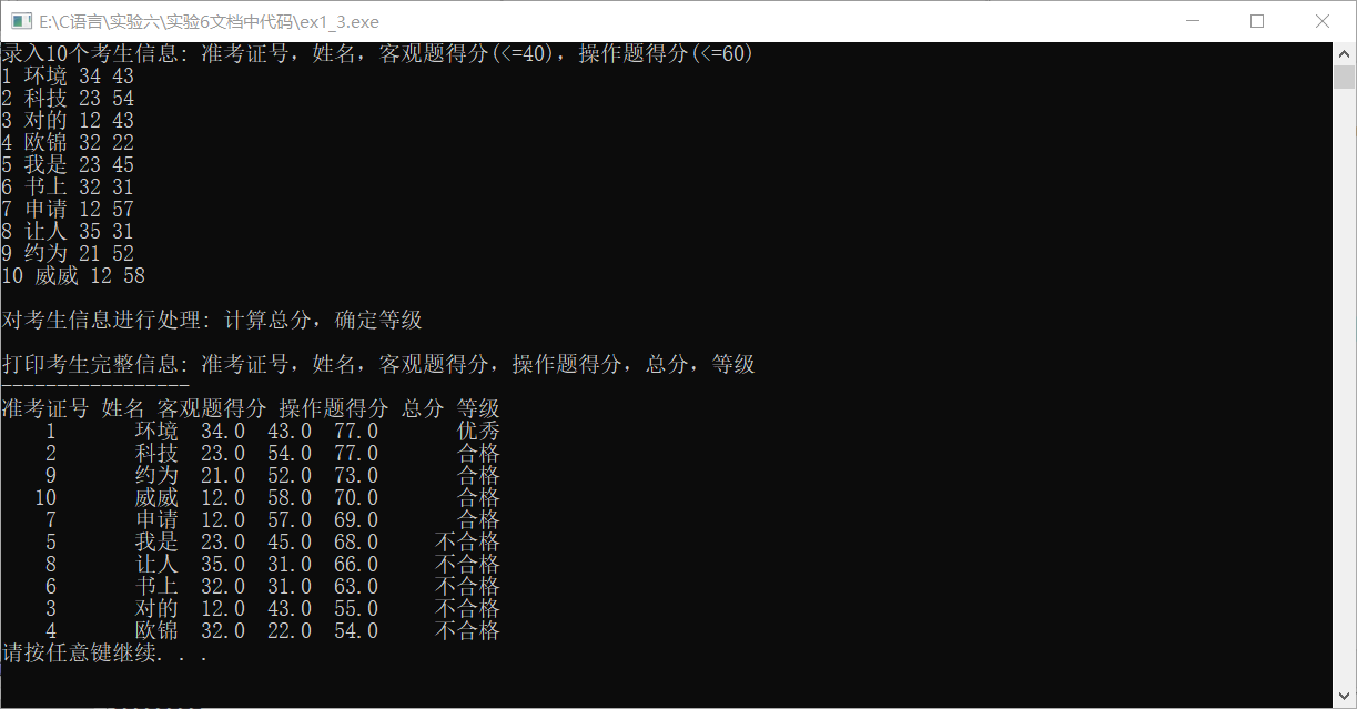 #include <stdio.h> #include <stdlib.h> #include <string.h> const int N = 10; // 定义结构体类型struct student,并定义其别名为STU typedef struct student { long int id; char name[20]; float objective; /*客观题得分*/ float subjective; /*操作题得分*/ float sum; char level[10]; }STU; // 函数声明 void input(STU s[], int n); void output(STU s[], int n); void process(STU s[], int n); int main() { STU stu[N]; printf("录入%d个考生信息: 准考证号,姓名,客观题得分(<=40),操作题得分(<=60)\n", N); input(stu, N); printf("\n对考生信息进行处理: 计算总分,确定等级\n"); process(stu, N); printf("\n打印考生完整信息: 准考证号,姓名,客观题得分,操作题得分,总分,等级\n"); output(stu, N); system("pause"); return 0; } // 录入考生信息:准考证号,姓名,客观题得分,操作题得分 void input(STU s[], int n) { int i; for(i=0;i<n;i++) scanf("%d %s %f %f",&s[i].id,s[i].name,&s[i].objective,&s[i].subjective); } //输出考生完整信息: 准考证号,姓名,客观题得分,操作题得分,总分,等级 void output(STU s[], int n) { int i; printf("-----------------\n"); printf("准考证号 姓名 客观题得分 操作题得分 总分 等级\n"); for(i=0;i<n;i++) printf("%5d %10s %5.1f %5.1f %5.1f %10s\n",s[i].id,s[i].name,s[i].objective,s[i].subjective,s[i].sum,s[i].level); } // 对考生信息进行处理:计算总分,排序,确定等级 void process(STU s[], int n) { int i,j; STU temp; for(i=0;i<n;i++) s[i].sum=s[i].objective+s[i].subjective;// 依次计算总分 for(i=0;i<n;i++) for(j=0;j<n-i-1;j++) if(s[j].sum<s[j+1].sum) //冒泡排序 { temp=s[j]; s[j]=s[j+1]; s[j+1]=temp; } for(i=0;i<n;i++)//level评定 { if((i+1)<=n*0.1) strcpy(s[i].level,"优秀"); else if((i+1)>n*0.1&&(i+1)<=n*0.5) strcpy(s[i].level,"合格"); else strcpy(s[i].level,"不合格"); } }