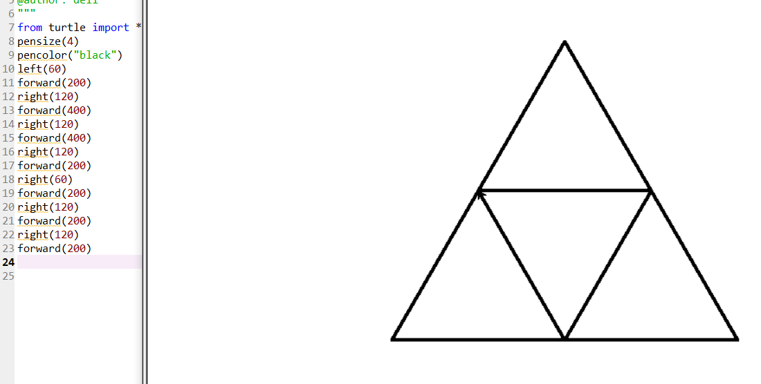 from turtle import * pensize(4) pencolor("black") left(60) forward(200) right(120) forward(400) right(120) forward(400) right(120) forward(200) right(60) forward(200) right(120) forward(200) right(120) forward(200)