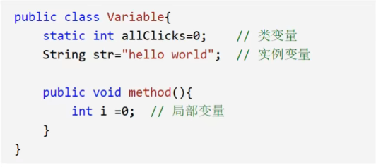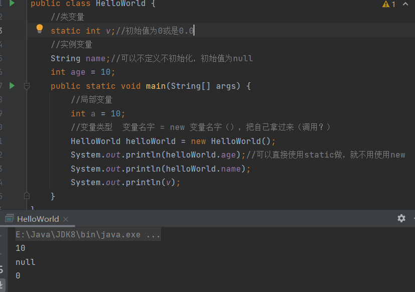 - 实例变量:从属于对象,如果不自行初始化,会输出这个类型的默认值(通常是0或0.0,布尔值默认为false)