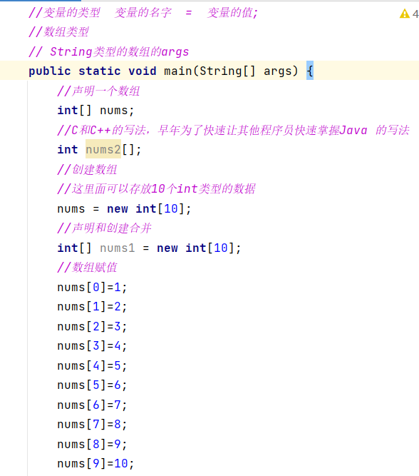 - 数组是引用类型,它的元素相当于类的实例变量,因此数组一经分配空间,其中每个元素也被按照实例变量同样的方式被隐式初始化
