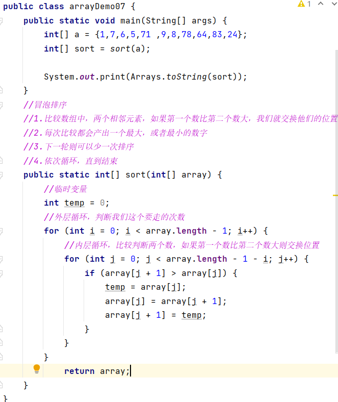 - 冒泡排序的代码相当简单,两层循环,外层是冒泡轮数,里层是依次比较