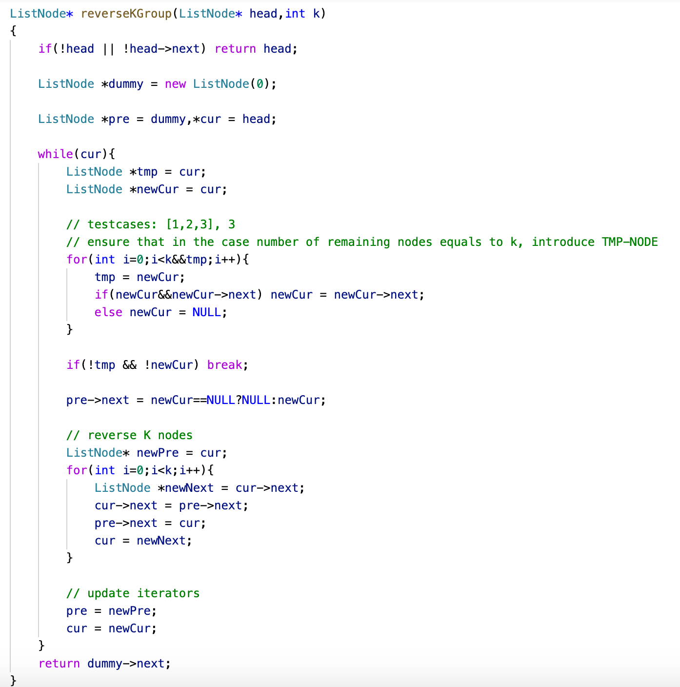 这一题又和上题类似,只不过每次操作变成了k个元素。把握每次遍历时的节点更新操作(newCur和newPre),每次移动的规律(这里是对k个进行移动)