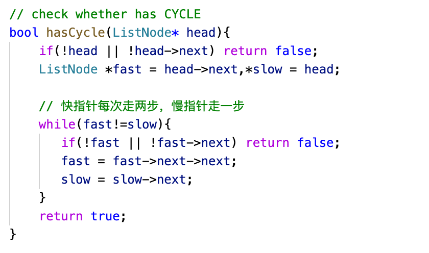 快指针每次走2步,慢指针每次走1步,判断是否会相等(或快指针先为空)