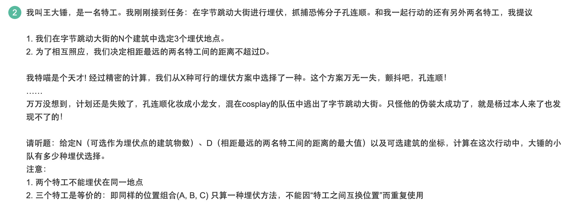 假定扫描到该位置,考虑以该位置作为第一个地点,再看剩下的数字能否构成其余两个点