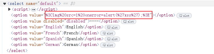 发现还是没有弹窗,查看网页源码发现,构造的语句被插入到了value中,此时我们需要把前面的select标签和option标签闭合掉,才能使用img标签