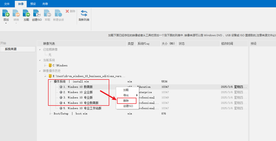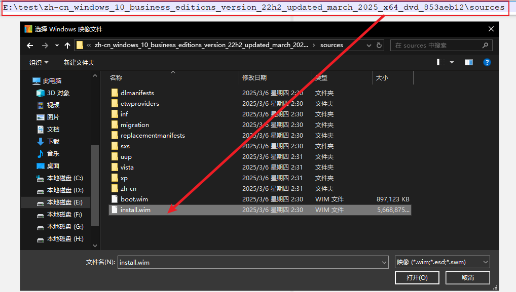 具体路径为:zh-cn_windows_10_business_editions_version_22h2_updated_march_2025_x64_dvd_853aeb12\sources\install.wim