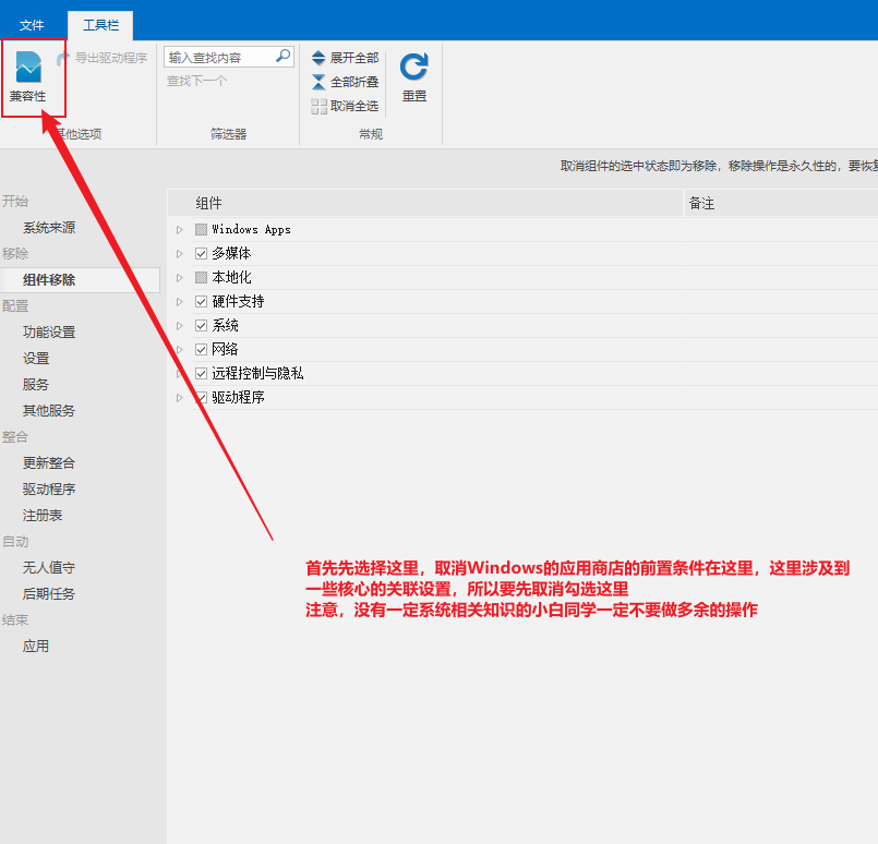 首先,需要在兼容性这里解锁Windows应用的前置条件(姑且这么称呼吧),这里涉及到一些核心的关联设置,如果这里不解锁应用商店就无法卸载