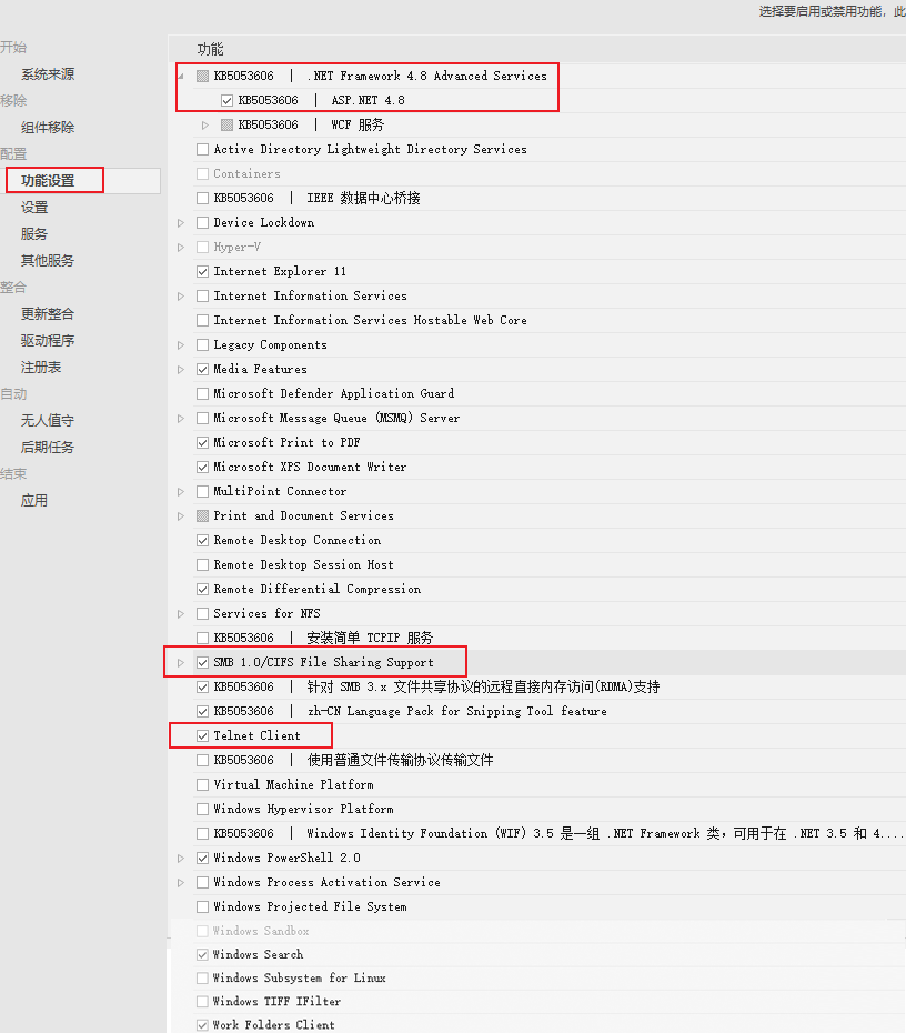 这里增加勾选的选项,是因为企业中会遇到应用程序依赖.Net框架,所以4.8必须要勾选, win10访问win7共享出来的文件,所以增加SMB 1.0;我的日常工作中会需要Telnet;