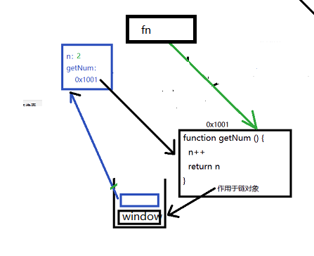 函数调用结束后:如果用fn指向这个getNum的作用域链对象。只要fn到getNum的指向没有消失。那么就可以一直访问到存储在内存的n.