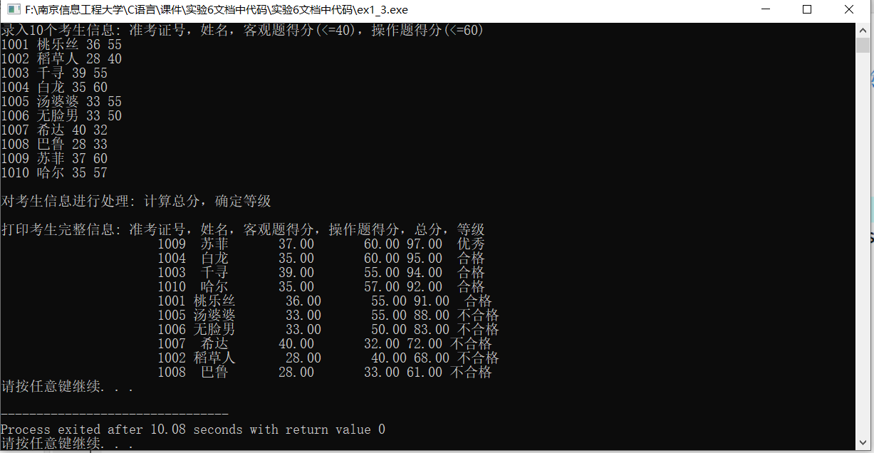 printf("\n打印考生完整信息: 准考证号,姓名,客观题得分,操作题得分,总分,等级\n");