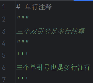- 多行注释:""" """或是''' ''' 引号中间写注释。