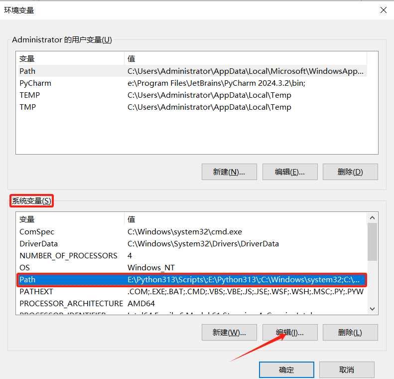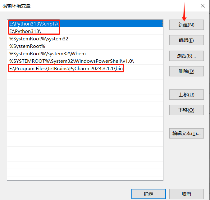 - 点击新建,把X:\python3.x.x和X:\python3.x.x\Scripts路径复制上去。然后一路的确定即可。