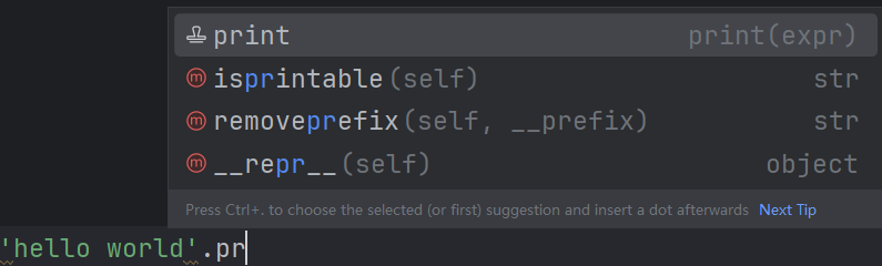 自动输入print()的小窍门。直接写要输出的代码,写好后直接在后面输入.p就会出现P相关的函数(功能),如果没出现,就再往后输入,直到看到,选择好回车。