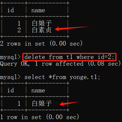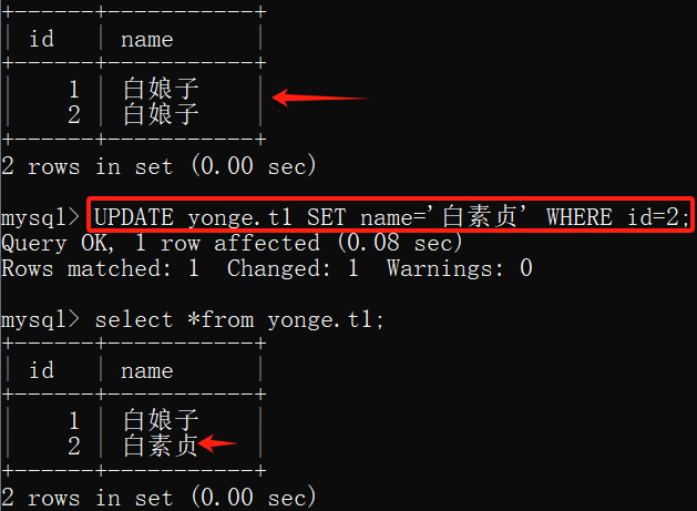 更改一条数据:update 数据库名称.数据表名称 set 字段=数据 where 字段=数据;