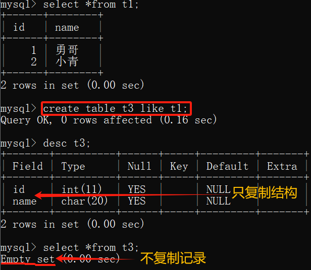 like:只复制表结构不复制记录 create table 新数据表名称 like 原数据表名称;