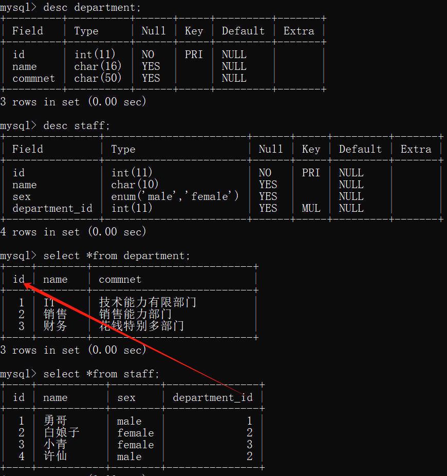 -- 创建 staff 关联表,并使用外键关联到 department 表 create table staff( id int primary key, name char(10), sex enum('male','female'), department_id int, foreign key(department_id) references department(id) ); -- 再在关联的staff数据表里插入数据 insert into staff values (1,'勇哥','male',1), (2,'白娘子','female',2), (3,'小青','female',3), (4,'许仙','male',2);
