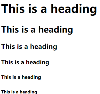 <h1>This is a heading</h1> <h2>This is a heading</h2> <h3>This is a heading</h3> <h4>This is a heading</h4> <h5>This is a heading</h5> <h6>This is a heading</h6>