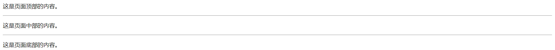 标签常用于诗歌、地址、电话号码等需要按行显示的文本内容中,以确保文本在页面上按照预期的格式进行排版。<p>这是页面顶部的内容。</p> <hr> <p>这是页面中部的内容。</p> <hr> <p>这是页面底部的内容。</p>