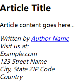 <article> <h2>Article Title</h2> <p>Article content goes here...</p> <address> Written by <a href="mailto:author@example.com">Author Name</a><br> Visit us at:<br> Example.com<br> 123 Street Name<br> City, State ZIP Code<br> Country </address> </article>