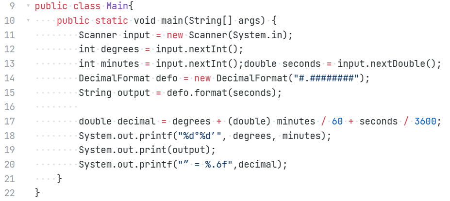 在第三次大作业中的7-6 GPS测绘中度分秒转换中,这道题看似简单,但是却有一个测试点一直过不去,参考测试样例“30 41 52.37”的输出结果是正确的,但是我改动输入结果,假如我不按要求输入,我输入3位小数以上就会出现答案错误,四舍五入的状况,经上网查询后得知可以使用DecimalFormat,修改后的代码如下: