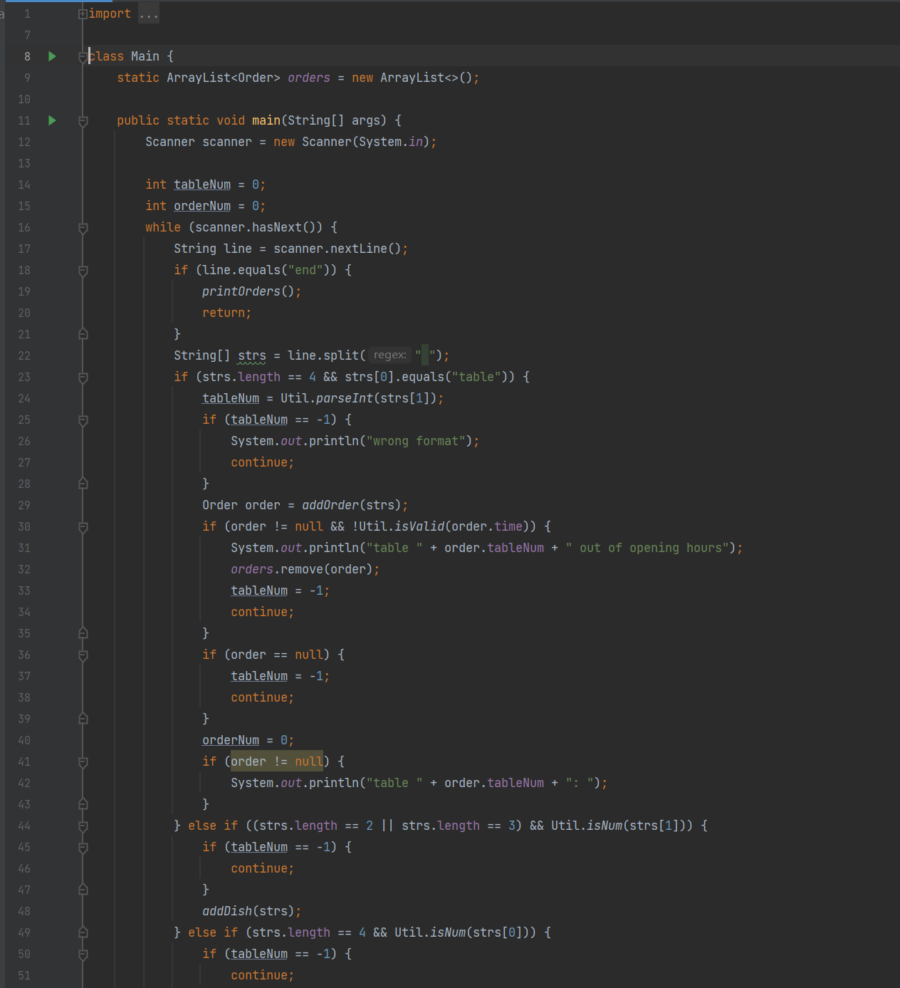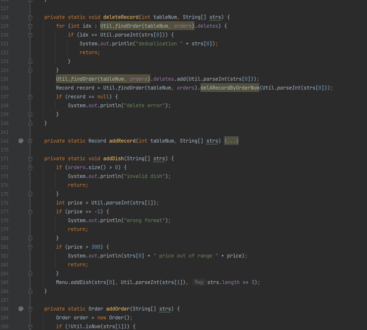 首先声明了一些变量和数据结构,包括Scanner对象用于接收用户输入,Menu对象用于管理菜单,Record对象数组用于存储点菜记录,orderList列表用于存储订单recordIndex和orderNum等辅助变量。进入一个无限循环,直到用户输入"end"时退出循环。循环体内部根据用户输入的不同进行相应的处理,包括添加菜品到菜单,创建订单,添加点菜记录和删除点菜记录。循环结束后,根据点菜记录生成订单信息并打印输出定义了一些辅助方法,包括判断时间是否在指定范围内的timeIsInRound方法,计算商品时间段对应折扣后总价的getDiscountTotalPrice方法,以及获取口味值和口味平均值的getTaste和getTasteAverage方法。