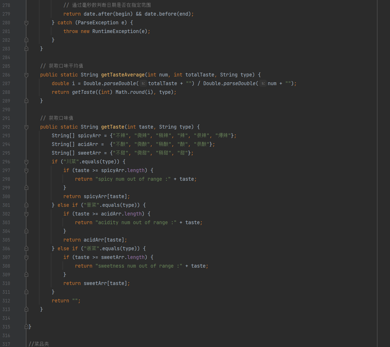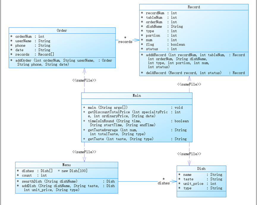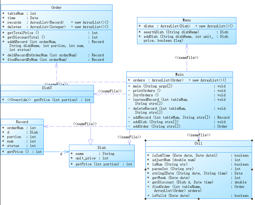 由类图可以明显的看出代码由7个类组成,除了老师提供的4个类和主类,还有一个工具类util类和特色菜类DishT,其中特色菜类用到了继承的关系,让DishT继承Dish。然后一些用于判断的方法和日期相关的方法统统放在工具类Util中,便于调用。