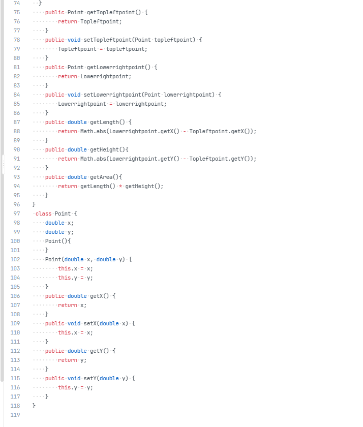 如果选择是2,表示用户希望计算矩形的面积。程序会读取四个浮点数分别表示矩形的左上角点和右下角点的坐标。然后,程序会创建一个Rectangle对象来表示矩形,其中使用了两个Point对象来表示左上角和右下角点。最后,将该对象添加到list中。循环会一直执行,直到用户输入选择为0,退出循环。