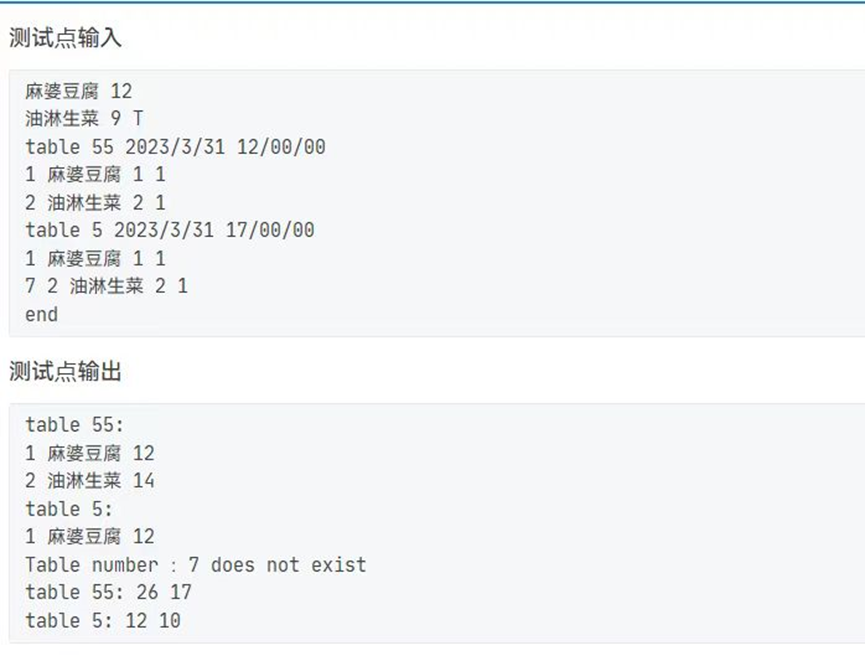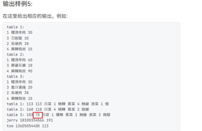 在这个测试点卡了特别久,要求说的是特色菜的份额必须是1和3,但是他这里2没算错,然后说输出的时候按桌号从小到大输出,但是他没按从小到大,我认为是老师给的测试点错了,后来问老师才知道特色菜没有份额的区别了,只有打折的不同。