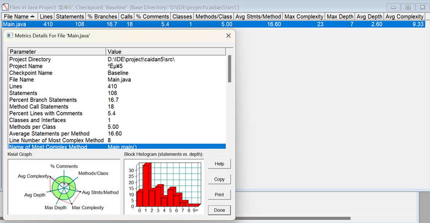 该代码总共有410行代码,包括空行,函数调用语句有18行,平均每个类中有5个方法,平均每个方法中有16.6行语句,可以看出代码的方法都是比较复杂的,每个功能差不多就对应一个方法。报表可以看出最大的圈复杂度有8,圈复杂度指示一个函数可执行路径的数目,相比于上次菜单,圈复杂度减少了很多,大部分原因都是因为减少了错误判断等代码,使得整体更加整洁。