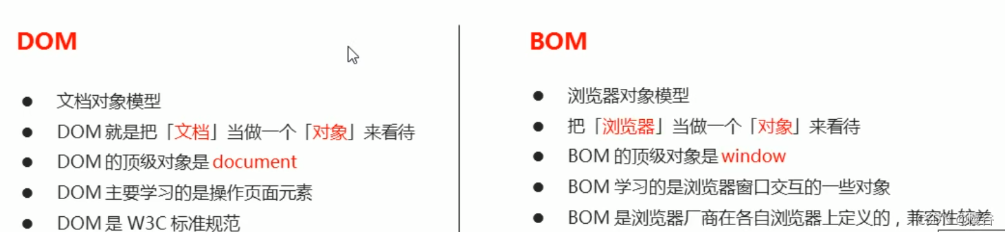 //BOM缺乏标准,JavaScript语法的标准化组织是ECMA,DOM的标准化组织是W3C,BOM最初是Netscape浏览器标准的一部分。