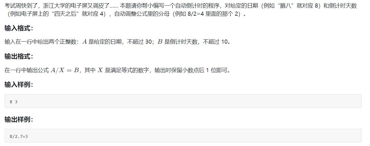 printf("%d/%.1lf=%d\n", A, (A * 1.0 / B), B);