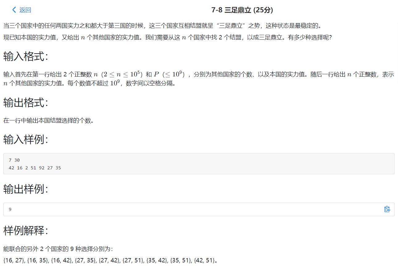 后面去leetcode找到了三角形选边的问题,可用二分、双指针来做,可leetcode是任意选三边,这道题是固定了一边,求另外两边。在草稿纸上写写画画,想用双指针来做,但是不可,因为固定的那条边可以是最大的边,也可以是小边中的任意一条...如果头铁写的话那就相当于枚举了,头痛。。。