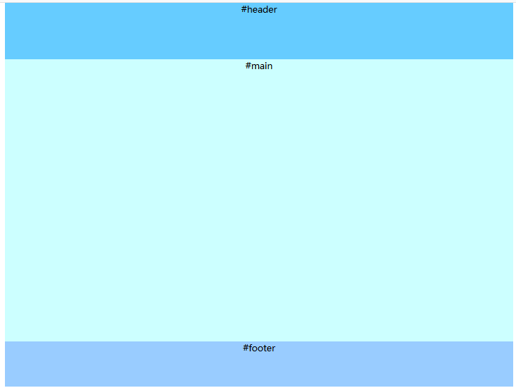 1 <!DOCTYPE html> 2 <html> 3 <head> 4 <meta charset="UTF-8"> 5 <title>上中下一栏式布局</title> 6 <style type="text/css"> 7 body{ 8 /*解决顶部的空白*/ 9 margin: 0; 10 } 11 .wrap{ 12 width: 900px; 13 margin: 0 auto; 14 text-align: center; 15 } 16 #header{ 17 height: 100px; 18 background: #6cf; 19 } 20 #main{ 21 height: 500px; 22 background: #ccffff; 23 } 24 #footer{ 25 height: 80px; 26 background: #99ccff; 27 } 28 </style> 29 </head> 30 <body> 31 <header id="header" class="wrap">#header</header> 32 <section id="main" class="wrap">#main</section> 33 <footer id="footer" class="wrap">#footer</footer> 34 </body> 35 </html>