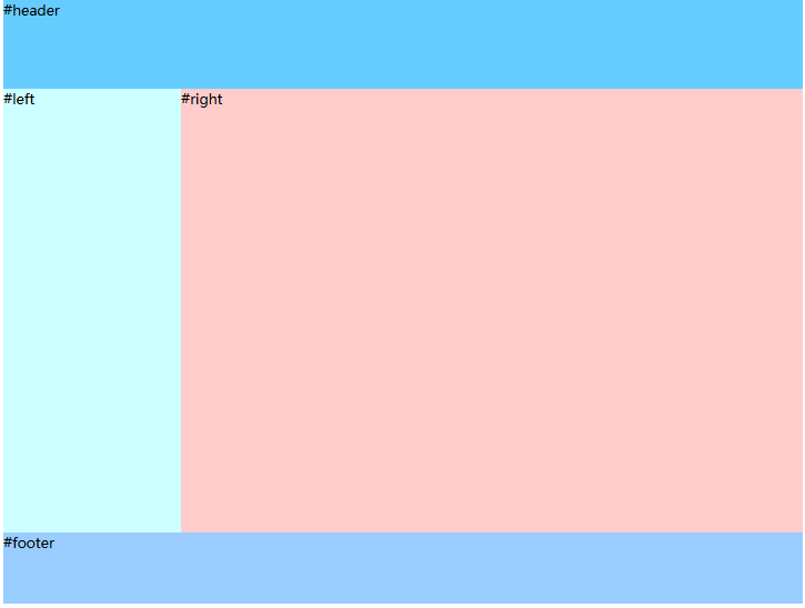 <!DOCTYPE html> <html> <head> <meta charset="UTF-8"> <title>左右两栏加页眉页脚</title> <style type="text/css"> .wrap{ margin: 0 auto; width:900px } #header{ height: 100px; background: #66ccff; } #main{ height: 500px; background: #ffcccc; } #footer{ height: 80px; background: #99ccff; } #left{ width: 200px; height: 100%; float: left; background: #CCFFFF; } #right{ width: 700px; height: 100%; float: right; } </style> </head> <body> <header id="header" class="wrap">#header</header> <section id="main" class="wrap"> <aside id="left">#left</aside> <div id="right">#right</div> </section> <footer id="footer" class="wrap">#footer</footer> </body> </html>