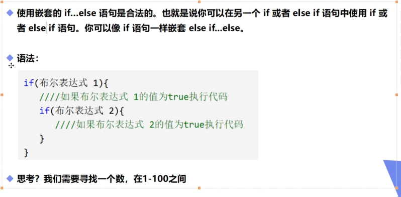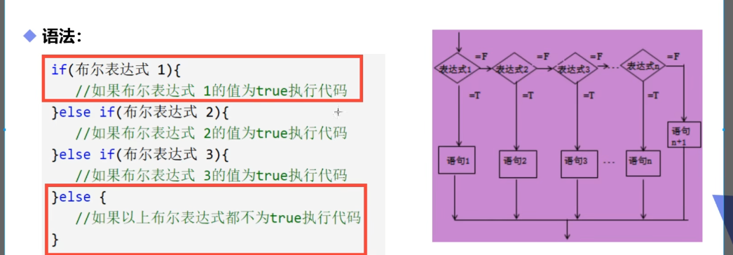 /* if 语句之多有1个else语句,else语句在所有的else if语句之后 if语句可以有若干个else if语句,它们必须在else语句之前 一旦其中一个else if语句检测到条件为true,其他else if以及else语句豆浆跳过执行 */