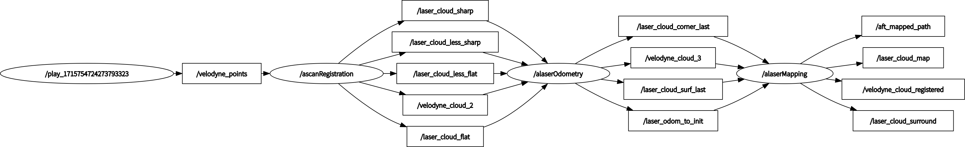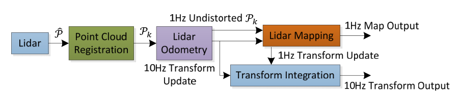 核心两部分,高频里程计和低频的建图,两种算法处理。里程计通过高频低数量的点云进行scan_to_scan匹配,估计出两帧之间的运动关系,输出结果给mapping算法;建图频率1hz,用scan_to_map的方式将去畸变的点云匹配并对齐到地图上。最后将两种算法发布的姿态变换集成,得到激光雷达姿态对于地图约10hz的变换输出。