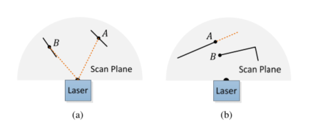 在选择特征点时,我们希望避免选择已经选择的点的临近点,或局部平面上大致平行于激光束的点(下图(a)中的点B),因为这些点太近了,很不可靠。此外,我们还希望避免位于遮挡区域边界上的点(下图(b)中的点A)。
