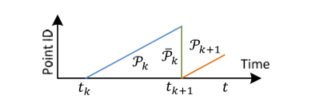 用里程计算法估计出激光雷达在一帧扫描范围内的运动。一帧扫描开始的时间是tk。在每次扫描结束时,得到扫描期间感知的点云Pk,将其重新投影到下一帧扫描时间戳tk+1,得到Pk,在下一次扫描k+1期间,Pk与新接收到的点云Pk+1一起使用,以估计雷达的运动。
