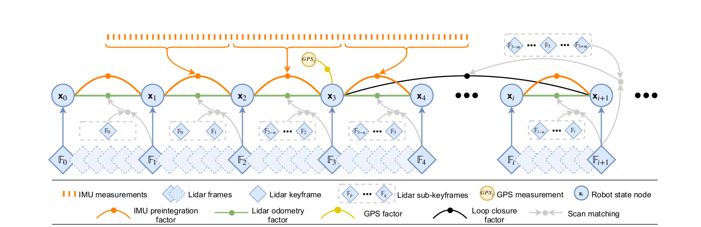 下图是LIO-SAM的因子图结构,变量节点是关键帧。相邻的关键帧之间,通过IMU数据计算预积分,获得位姿变换,构建IMU预积分因子。每个关键帧还有对应的GPS数据参与校正。如果有闭环出现,闭环帧之间可以构建约束。关键帧之间有若干普通帧,这些帧不参与图优化,但是会执行scan-to-map的配准,优化每帧位姿。