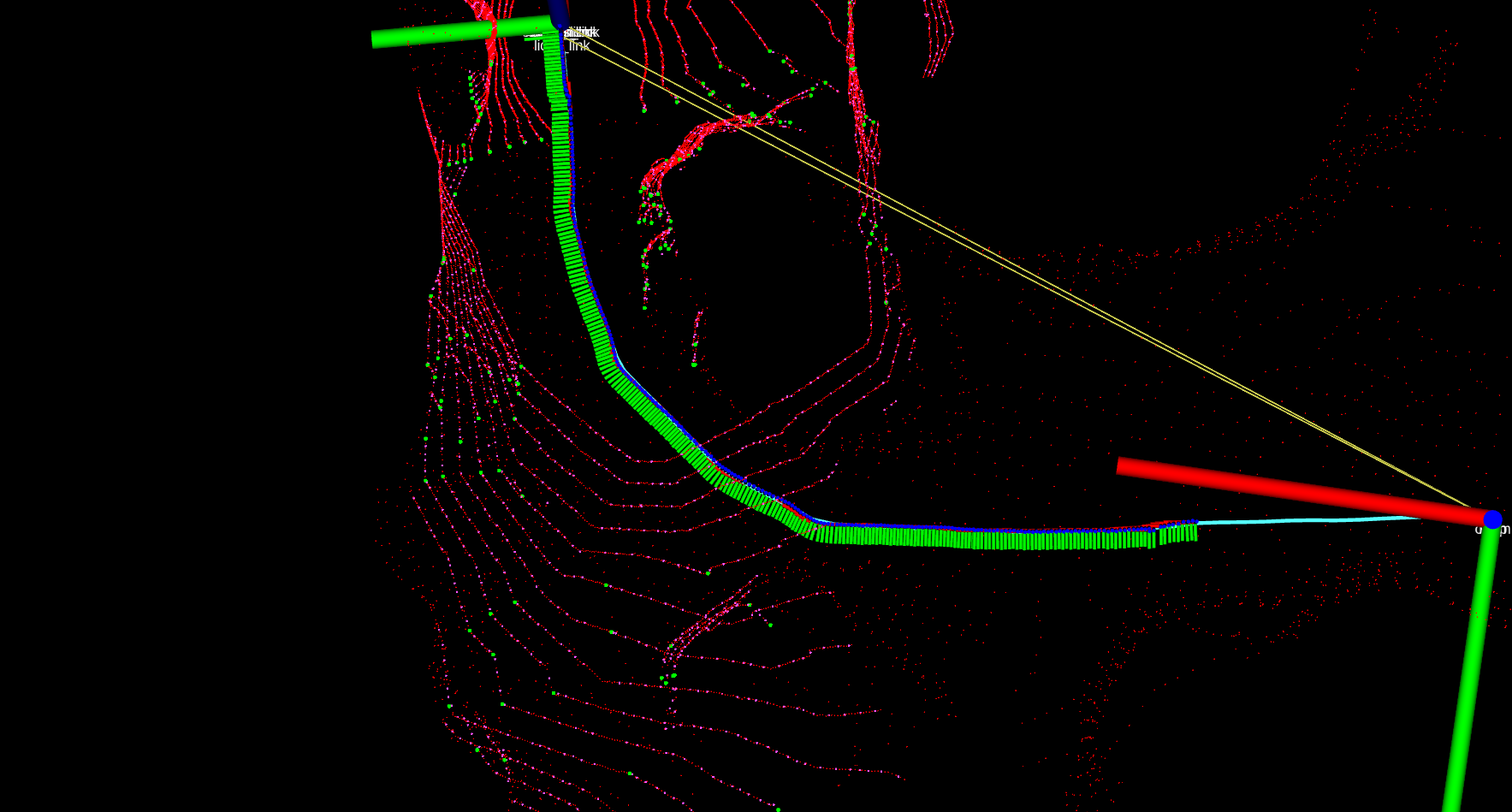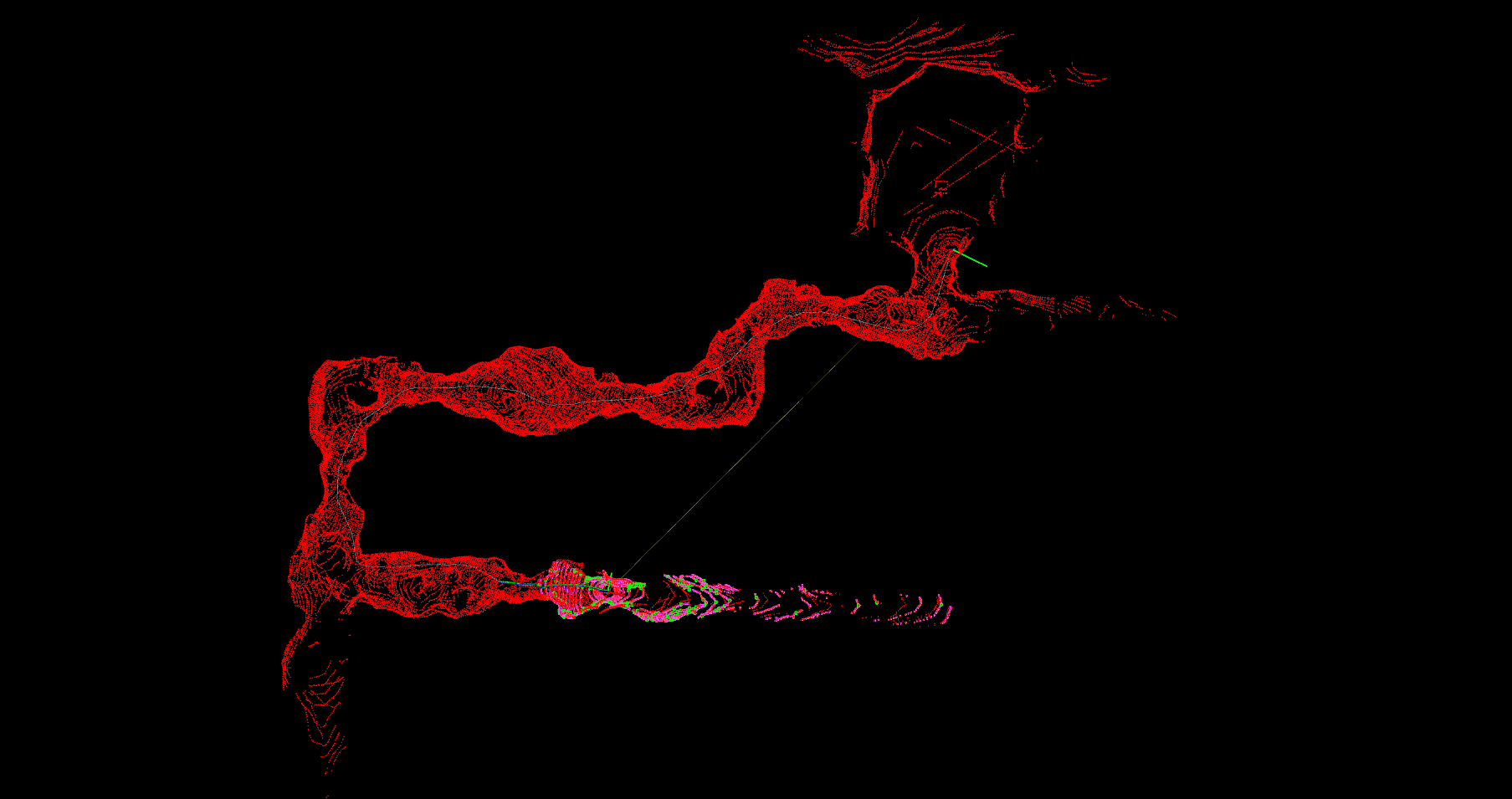 上图红色为scan_to_scan输出的10hz高频里程计,绿色为scan_to_map的1hz里程计。