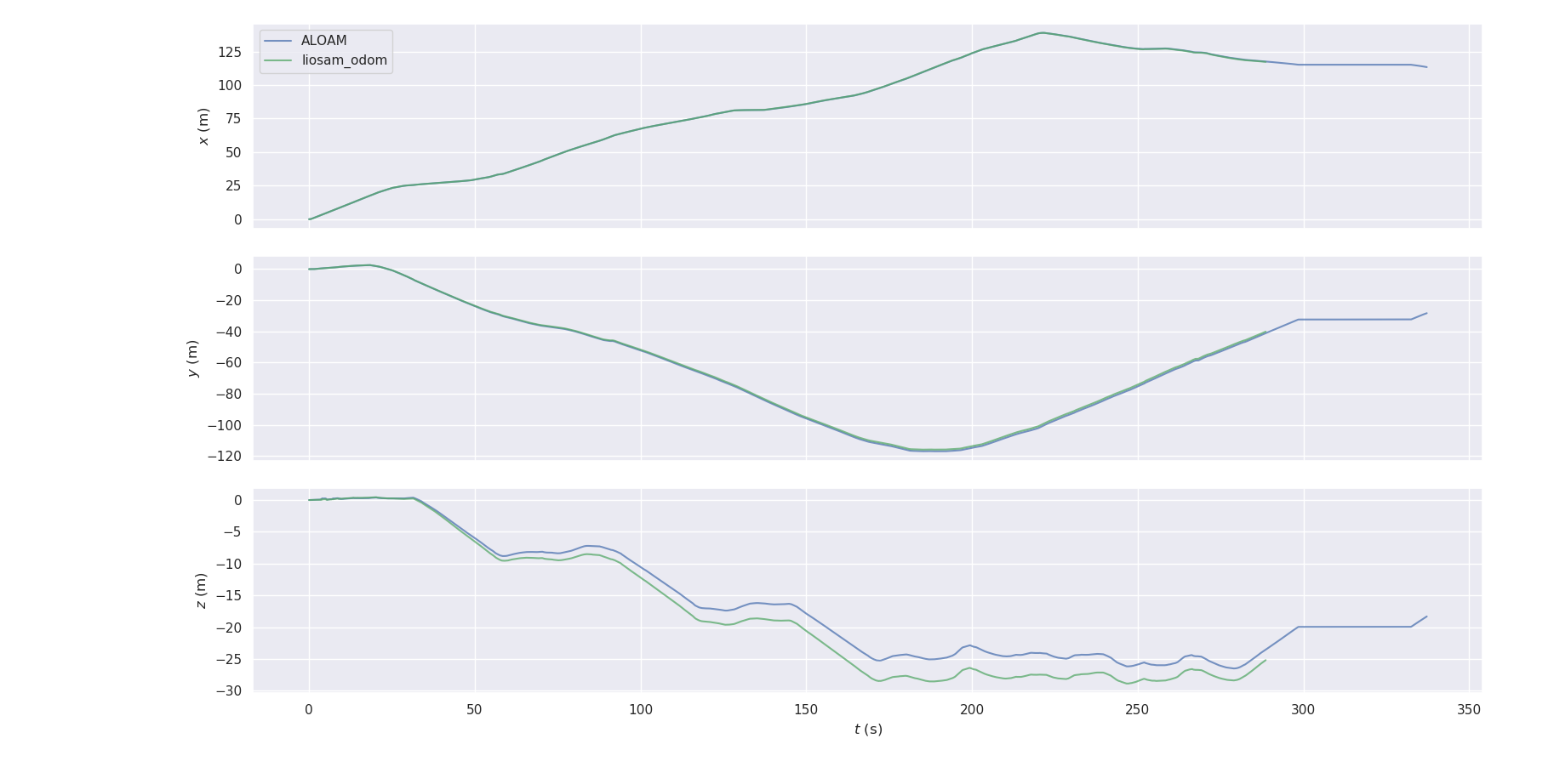 通过下图xyz坐标对比发现偏差出现在z轴上。这是因为liosam利用imu的数据对z轴坐标进行了一定的约束。