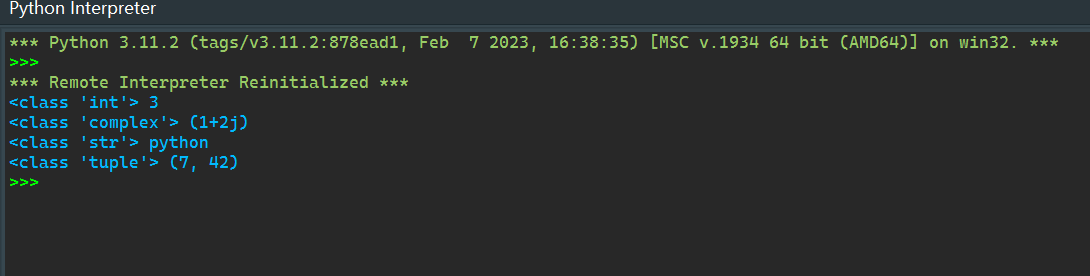 r1 = eval('1 + 2') print(type(r1), r1) r2 = eval('1+2j') print(type(r2), r2) r3 = eval('"python"') print(type(r3), r3) r4 = eval('7, 42') print(type(r4), r4)