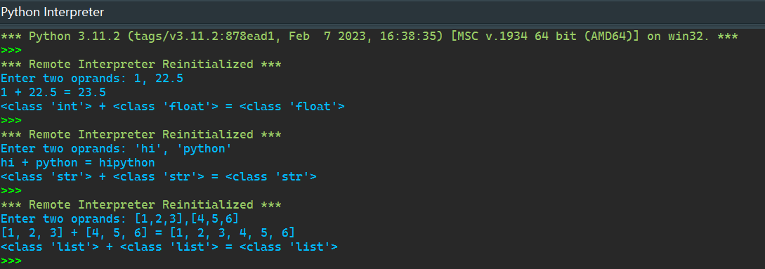 # 组合使用内置函数eval()和input() x, y = eval(input('Enter two oprands: ')) ans = x + y print(f'{x} + {y} = {ans}') print(f'{type(x)} + {type(y)} = {type(ans)}')