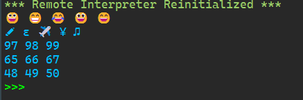 print(chr(0x1f604)) print(chr(10000), end=" ") print(chr(0x025b), end=" ") print(chr(0x2708), end=" ") print(chr(0x00A5), end=" ") print(chr(0x266b)) print(ord('a'), end = " ") print(ord('b'), end = " ") print(ord('c')) print(ord('A'), end = " ") print(ord('B'), end = " ") print(ord('C')) print(ord('0'), end = " ") print(ord('1'), end = " ") print(ord('2'))