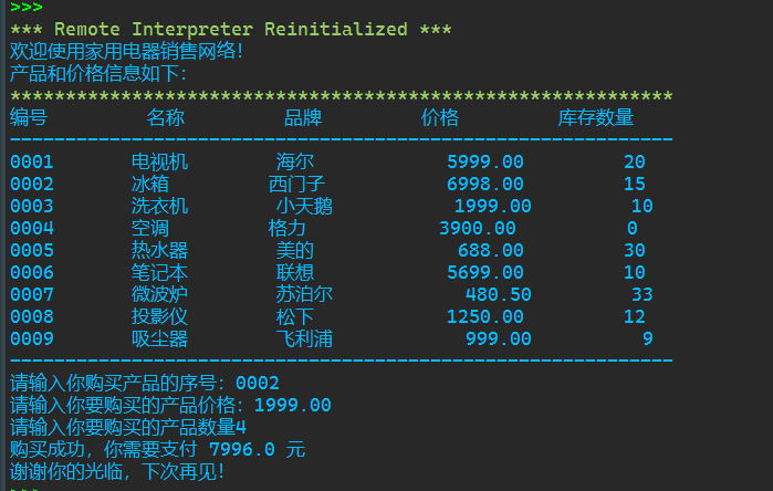 """ 家用电器销售系统 v1.0 """ #欢迎信息 print('欢迎使用家用电器销售网络!') #产品信息列表 print('产品和价格信息如下:') print('*'*60) print('%-10s'%'编号', '%-10s'%'名称', '%-10s'%'品牌', '%-10s'%'价格', '%-10s'%'库存数量') print('-'*60) print('{:<10}{:<10}{:<10}{:<10}{:>10}'.format('0001','电视机','海尔','5999.00','20')) print('{:<10}{:<10}{:<10}{:<10}{:>10}'.format('0002','冰箱','西门子','6998.00','15')) print('{:<10}{:<10}{:<10}{:<10}{:>10}'.format('0003','洗衣机','小天鹅','1999.00','10')) print('{:<10}{:<10}{:<10}{:<10}{:>10}'.format('0004','空调','格力','3900.00','0')) print('{:<10}{:<10}{:<10}{:<10}{:>10}'.format('0005','热水器','美的','688.00','30')) print('{:<10}{:<10}{:<10}{:<10}{:>10}'.format('0006','笔记本','联想','5699.00','10')) print('{:<10}{:<10}{:<10}{:<10}{:>10}'.format('0007','微波炉','苏泊尔','480.00','33')) print('{:<10}{:<10}{:<10}{:<10}{:>10}'.format('0008','投影仪','松下','1250.00','12')) print('{:<10}{:<10}{:<10}{:<10}{:>10}'.format('0009','吸尘器','飞利浦','999.00','9')) print('-'*60) #用户输入信息 product_id = input('请输入你购买产品的序号:') price = float(input('请输入你要购买的产品价格:')) count = int(input('请输入你要购买的产品数量')) #计算金额 print('购买成功,你需要支付',price*count,'元') #退出系统 print('谢谢你的光临,下次再见!')