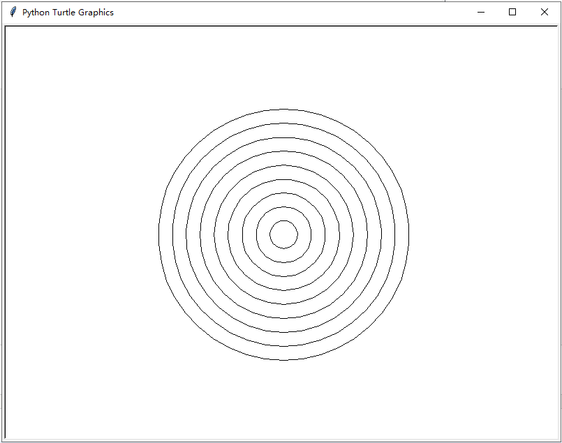 1 from turtle import * 2 def moveto(x, y): 3 penup() 4 goto(x, y) 5 pendown() 6 def main(): 7 setup(800, 600) 8 radius = 20 9 offset = 20 10 for i in range(9): 11 moveto(0, -radius) 12 circle(radius) 13 radius += offset 14 hideturtle() 15 done() 16 main()